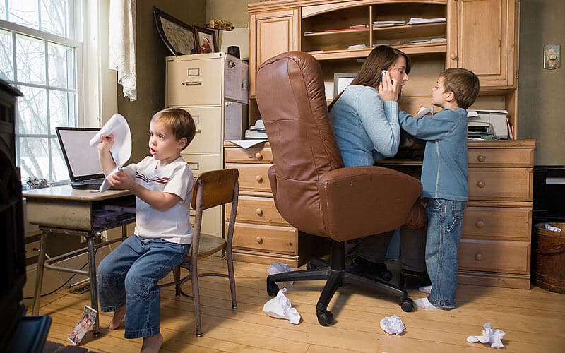وقتی منشی در منزل تماس مشتری را پاسخ میدهد، همزمان صدای تلویزیون و احتمالاً بچه نیز به گوش میرسد.