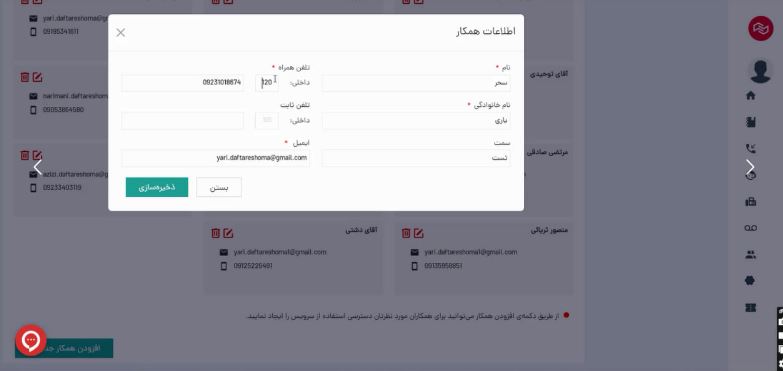 از این پس در صفحهی همکاران، شما میتوانید میتواند یک شمارهی داخلی اختصاصی ۲ تا ۴ رقمی انتخاب نماید و در زمان انتقال تماس از آن شمارهی داخلی استفاده نماید. شمارهی داخلی همکار اختصاصی(یونیک) بوده و در صورت تکراری بودن داخلی در زمان ذخیرهسازی تغییرات پیغام خطای “شمارهی داخلی وارد شده به همکار دیگری اختصاص دارد!” نمایش داده میشود. همچنین وارد کردن این شماره الزامی نیست.