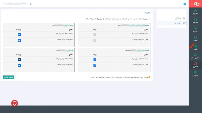 همینطور شما میتوانید در بخش همکاران اطلاعات تماس یکی از کارکنان خود را ثبت کنید تا این اطلاعات به او پیامک شود. مثلا شما میتوانید شماره موبایل یکی از همکاران بخش مالی را در این قسمت اضافه کنید تا پیامکهای مربوط به انقضای خط و سرویسها و همینطور منفی شدن اعتبار حساب برای او ارسال شود.