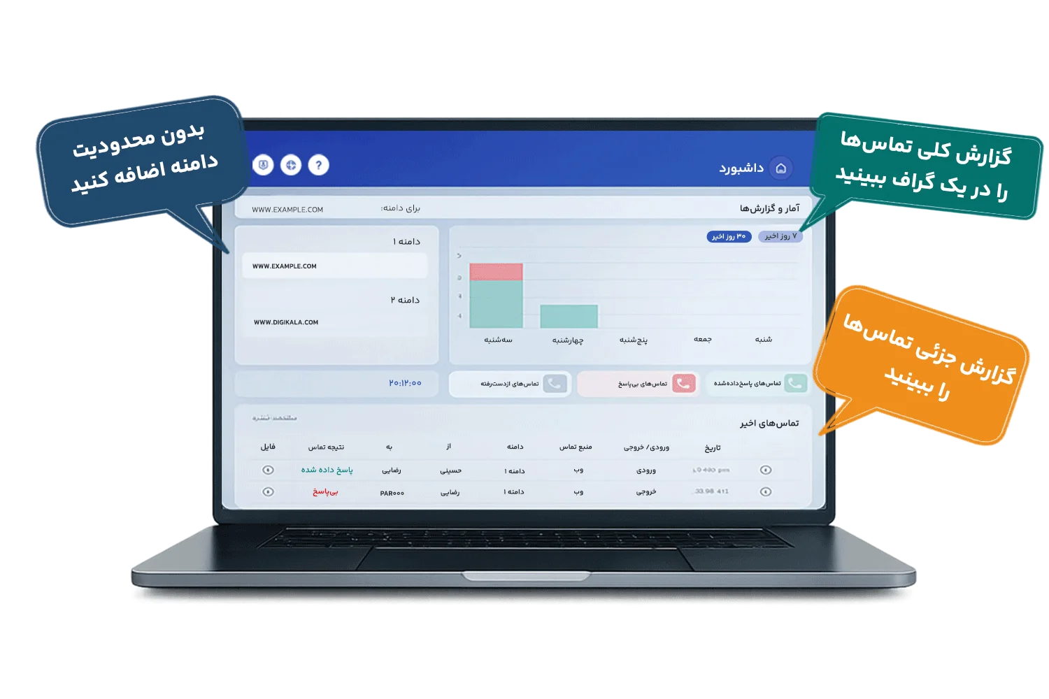 با «درتماس»، کاربران وبسایت شما میتوانند، علاوه بر چت آنلاین، به طور مستقیم با اپراتورهایتان تماس صوتی یا تصویری بگیرند و سریعتر پاسخ سوالات خود را دریافت کنند.